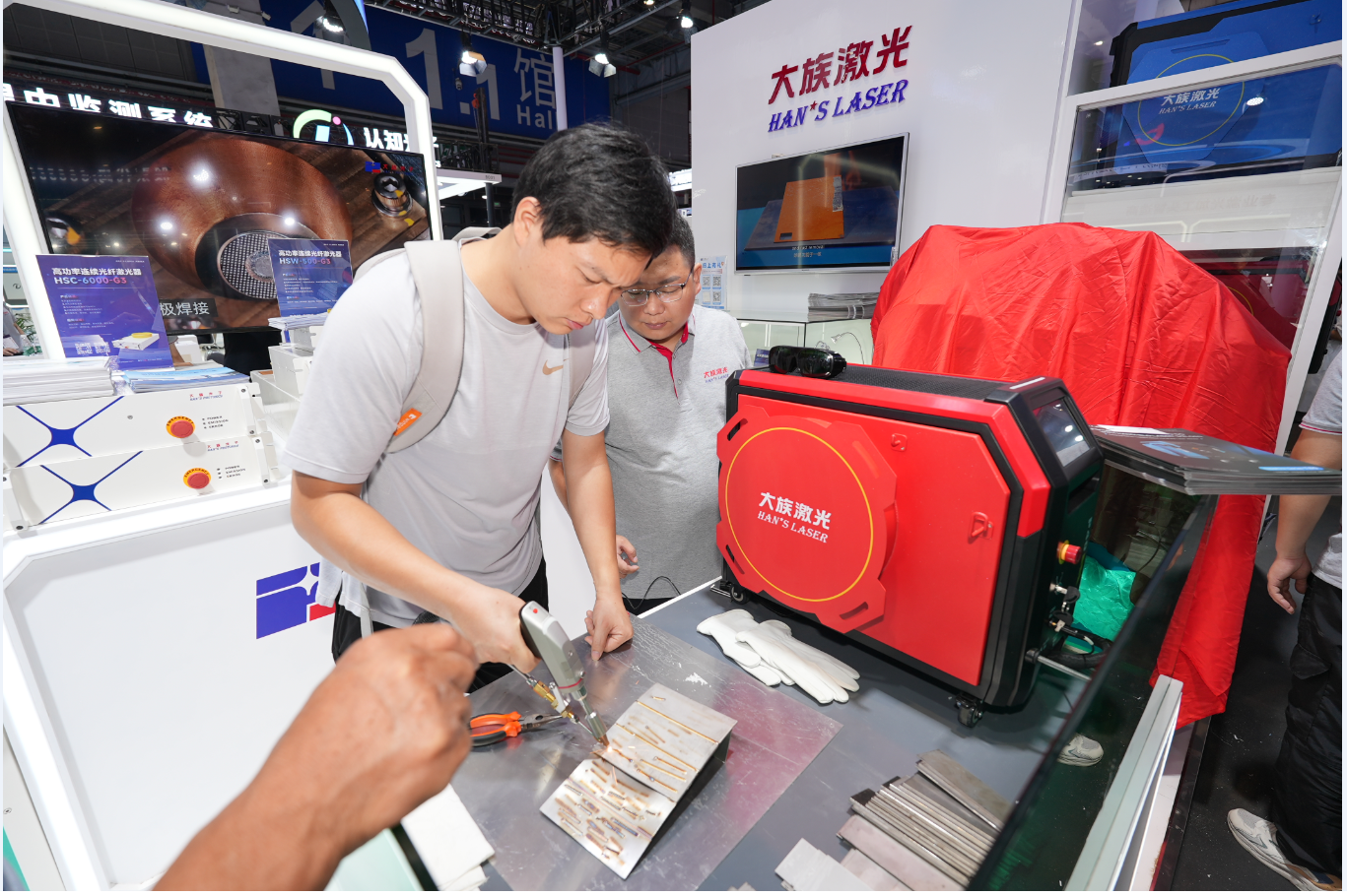 展會首日,大族鐳射“藍晶”系列雷射手持焊接一體機新品重磅發佈,以“老手藝,新幹法”為覈心理念,全面覆蓋從精密焊接至重工厚板的多元應用場景,重新定義手持鐳射的效能標杆,吸引了眾多行業觀眾及媒體關注。