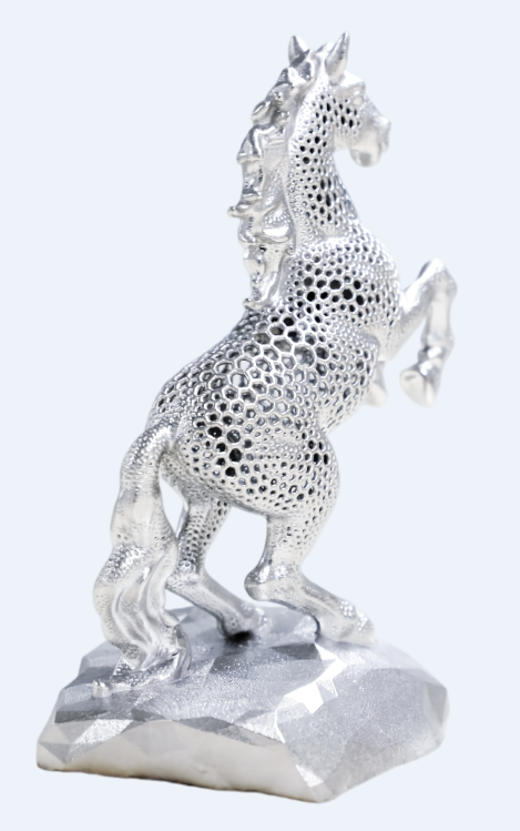 擔心擺件太占地方? 這款駿馬擺件給出了完美答案。 採用鈦合金資料進行列印,尺寸僅為101*75*138mm,重量約165g。專為現代空間設計,不挑場景——辦公桌、書架、玄關、櫥窗……隨處一放,皆是氣場。